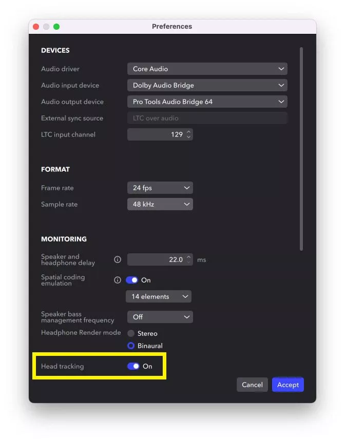 To use head tracking with the Dolby Atmos Renderer, you will need a compatible head tracking device. Currently, the only supported device is the Supperware Head Tracker 1 but we expect additional devices to be available in the future.